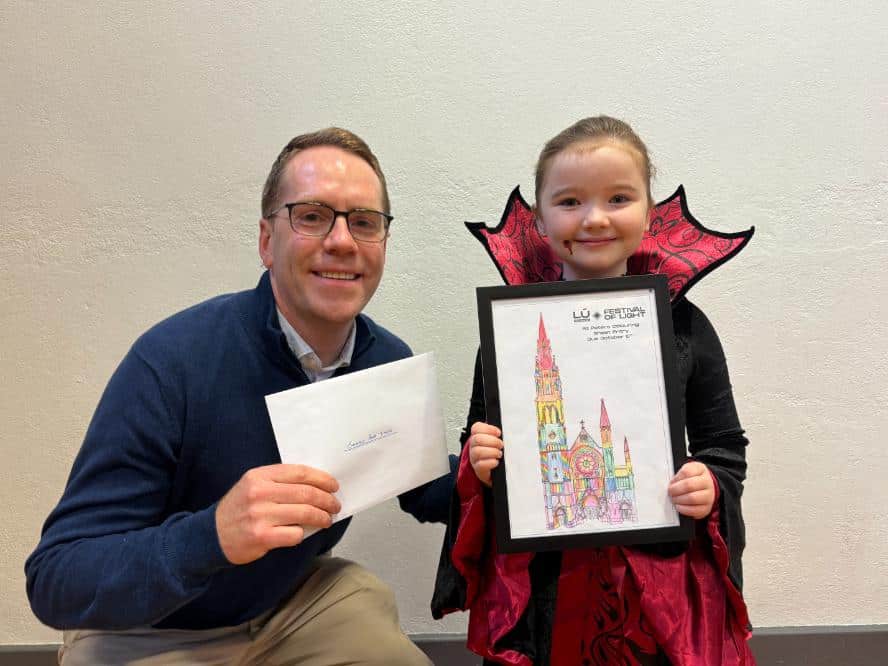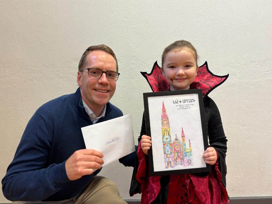 A very special presentation was also made to P4 pupil Anaoise McArdle, who won the Lú Festival of Light colouring competition. With over 500 entries from school pupils across the North and South of Ireland, Armagh pupil Anaoise’s colourful and imaginative design of St Peter’s Church in Drogheda was the star winner.