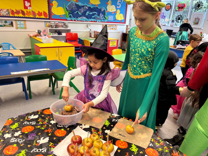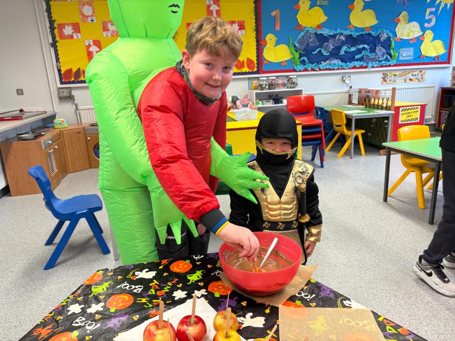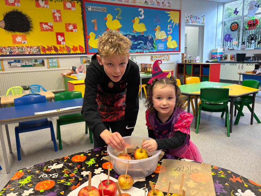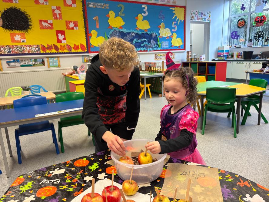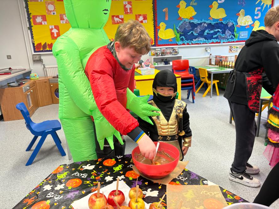 Pupils who take part in the ‘buddy system’ were also treated to an extra-special surprise. The buddy system pairs a P7 pupil with a P1 pupil when they first start school. The P7 buddy helps their new cub settle into school life, and today the pairs met up and had fun making chocolate-covered apples!