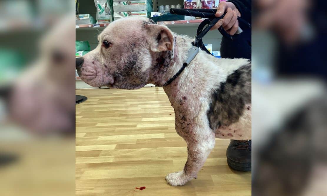 The Council’s Animal Welfare Officers attended the property and found an adult male Staffordshire Bull terrier type dog in very poor condition, with open weeping sores over the whole body. The dog was clearly in pain, crying and whimpering and had a noxious odour.