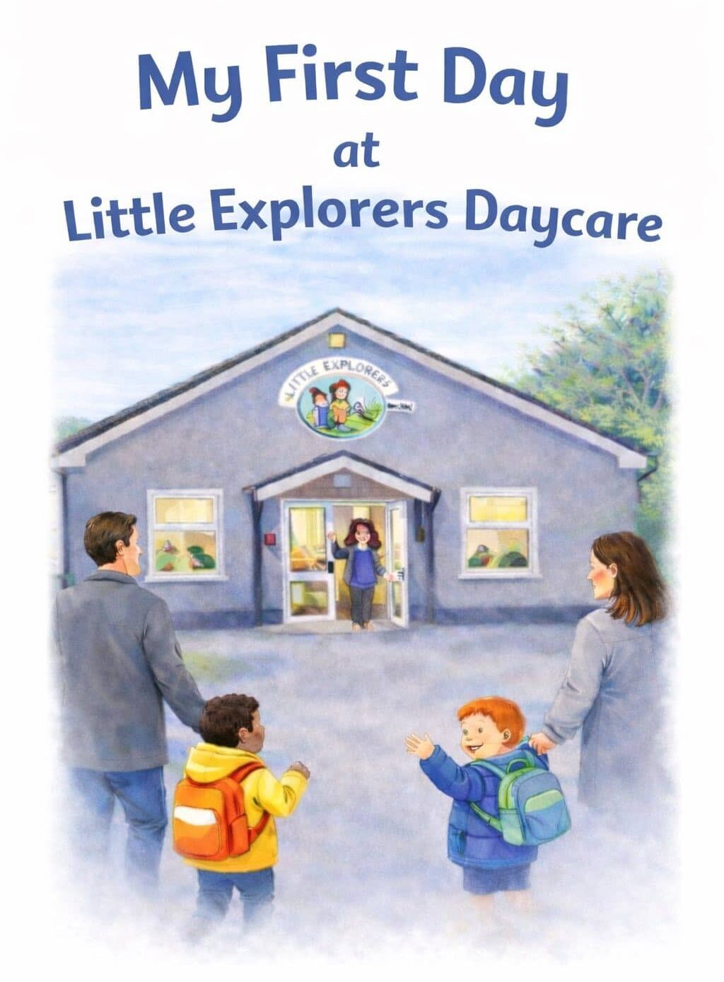 The book is entitled My First Day at Little Explorers Daycare, and on its cover is described as a “gentle story created to support children and families through the early years of childcare”.