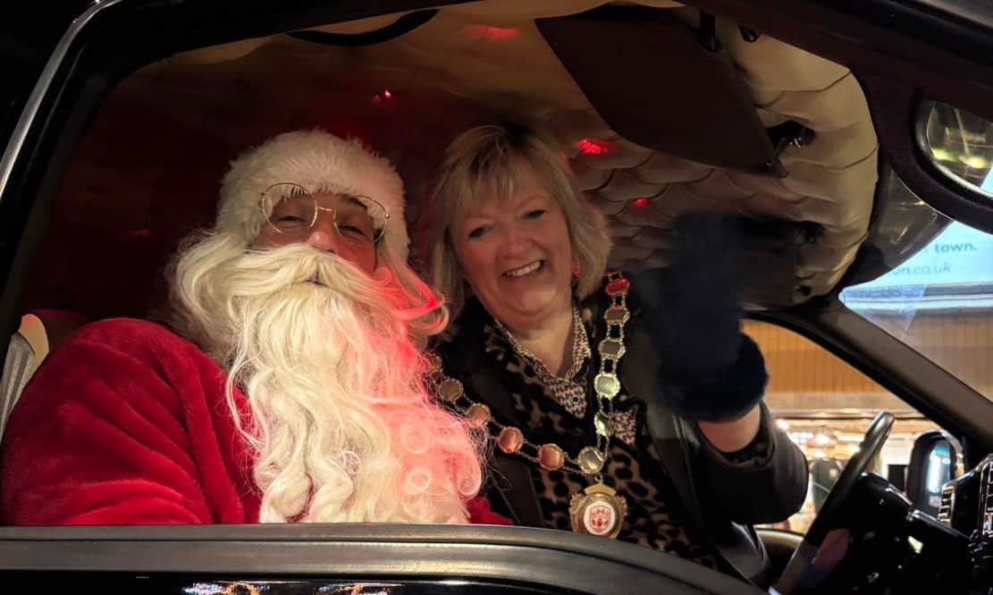 Santa then arrived in style by SJ Davidsons Motors to turn on the town’s Christmas lights with Chair of Mid Ulster District Council, Councillor Frances Burton.